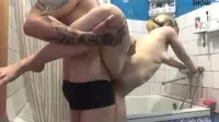 The video begins with a stunning blonde woman taking a luxurious bath in an opulent, candlelit bathroom.She is naked, showing off her flawless physique and alluring tattoos, as the steamy atmosphere surrounds her like a soft blanket.Her eyes close as she savors the scent of her bubble bath, oblivious to the man waiting for her outside the door.Meanwhile, the man is standing at attention, his dick throbbing as he watches his beautiful partner in the bathroom.He takes off his robe, revealing his chiseled body and impressive erection.His eyes are glazed with desire, anticipating the pleasure that awaits him.The blonde woman gets out of her bath, wrapping herself in a fluffy towel as she exits the tub.Her skin glistens from the water, and she shivers from the chill in the air.The man walks over to her and helps dry her off with the large, soft towel, their gazes never leaving each others.As the woman lowers herself into another seat in the room, the man goes down on her, sucking and licking her clit with gusto.Her body convulses as she enjoys his expert oral pleasure, her moans growing louder and more fervent.He moves to his knees before the woman, taking her throbbing, wet pussy in his mouth once more.His tongue dances around her sensitive parts, teasing her into an even greater level of arousal.He then positions himself behind her and starts pressing his hard cock against her ass, his erection demanding for penetration.Fuck me, she whispers, the word laced with desire as she pushes herself onto him, feeling him enter her.The sensation is electric, leaving both of them gasping in pleasure.Their bodies press together as they fuck hard and passionately.He pulls out, and she impales herself on his throbbing member once again.She rides him like a wild woman, bouncing up and down while he grips her hips tightly.As the mans cock slides into her, the blonde reaches for a vibrator, pressing it against her clit with excitement.Her moans mix with the sounds of flesh hitting flesh as they fuck in this tantalizing display of passion.Their bodies glisten with sweat, the room filled with the scent of their lust and desire.The womans orgasm approaches, her pussy convulsing around his erect cock.He picks up her pace, fucking her harder and faster until she cumshots all over his cock.Her juices flow in torrents, soaking him completely as he continues to piston into her.Unable to hold back any longer, the man pulls out just in time for a massive, gushing load to shoot all over her ass cheeks and back.The bathroom steams with the smell of their sexual fluids mixing, and the waterfalllike sounds of their pleasure echoing against the rooms walls.As they lay there in each others arms, both drenched and satisfied, they share a passionate kiss as they enjoy the afterglow of their exciting bathroom fucking experience.